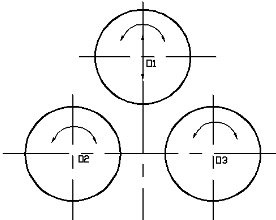 1.1:主傳動指上輥繞O1,下輥分別繞O2、O3作順時針或逆時針旋轉(zhuǎn)。它是以兩根下輥為主驅(qū)動 ,由主電機、主減速機、連軸器、及開式齒輪組成。工作時上輥由板料間的摩擦力帶動,同時作為從動軸,起調(diào)整擠壓工件的作用。輔傳動由單獨的傳動系統(tǒng)控制上輥的上升或下降。由上輥升降電動機、減速機、連軸器、蝸輪、蝸桿、絲母、絲桿組成。工作時,由減速機帶動蝸桿轉(zhuǎn)動蝸輪內(nèi)絲母旋轉(zhuǎn),使絲桿及上輥軸承座作升降運動,使上輥上升或下降。卷板時,在上輥的下降壓力下,通過兩下輥正反轉(zhuǎn)動,使板料達到所需的曲率,形成預(yù)計的圓形或弧形。